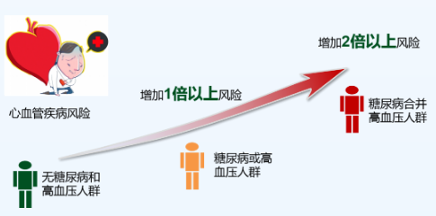 和無(wú)糖尿病、高血壓的人群相比,患糖尿病或高血壓能使心血管疾病風(fēng)險(xiǎn)增加1倍以上,同時(shí)患糖尿病和高血壓的患者,心血管疾病風(fēng)險(xiǎn)增加2倍以上。