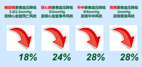 實(shí)驗(yàn)數(shù)據(jù)證實(shí)在伴有高血壓合并癥的患者中,血壓輕度降低就能極大地降低相關(guān)心血管風(fēng)險(xiǎn)和腎功能衰竭的風(fēng)險(xiǎn)。
