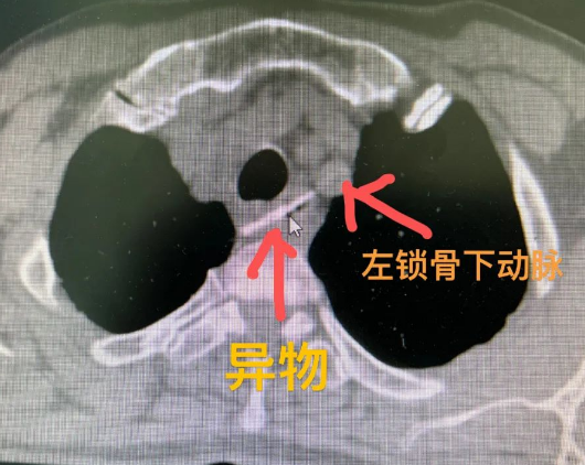 3厘米“V”形雞骨頭卡在食道,咽不下去,吐不出來(lái),更為嚴(yán)重的是,這根硬骨頭距離左鎖骨下動(dòng)脈僅2㎜......