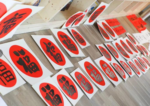 “厚德載物”、“寧靜致遠(yuǎn)”、“天高海闊”......一張張燙金的紅紙散發(fā)著墨香,一個(gè)個(gè)“?!弊衷诳w、行書、草書間自由切換,書法蒼勁有力、磅礴大氣,在紅色的襯托下更顯喜慶祥和。