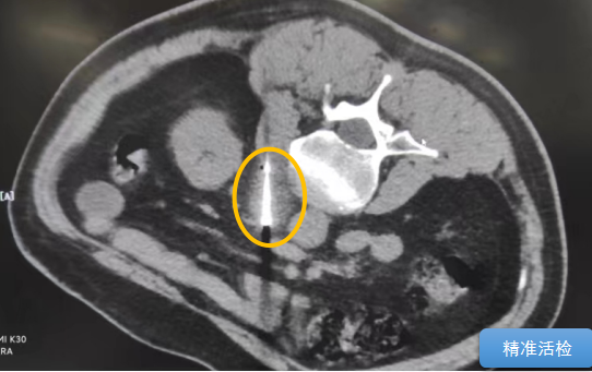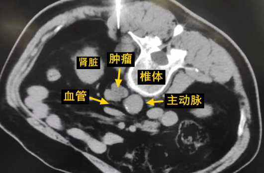 經(jīng)過多學(xué)科討論,陳寶瑩主任根據(jù)影像資料指出,患者轉(zhuǎn)移瘤位于腹膜后,內(nèi)側(cè)瀕臨人體最大的血管——主動脈;前方同樣有血管緊貼腫瘤;外側(cè)是腎臟,后方是椎體和神經(jīng),夾縫中進(jìn)針難度大,治療時要避免周圍重要臟器、血管和神經(jīng)的損傷,因此可以選擇CT引導(dǎo)下精準(zhǔn)穿刺活檢同步冷凍消融治療,即獲得病理組織有利于下一步全身治療方案的調(diào)整,同時殺死腹膜后轉(zhuǎn)移瘤,周圍正常組織損傷的可能性也小。