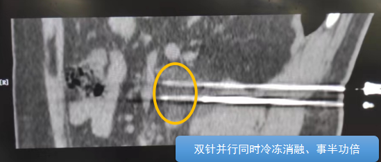 這個患者病變位置刁鉆,穿刺難度大,冷凍消融的難點在于既要不損傷膈肌和肺組織,同時又要盡最大可能完全消融腫瘤。術(shù)前陳寶瑩主任、李鐵柱教授、兀云飛醫(yī)生詳細(xì)設(shè)計進(jìn)針路徑、布針計劃,術(shù)中微創(chuàng)團(tuán)隊協(xié)調(diào)配合,李鐵柱教授仔細(xì)操作,精準(zhǔn)到位,順利完成兩個病變的布針,遂啟動治療,先快速降溫到-150多度,再升溫至15?,經(jīng)過兩個循環(huán)反復(fù),即刻觀察到病變完全被冰球覆蓋,同時周圍臟器無損傷,術(shù)中患者幾乎沒有疼痛,還和醫(yī)生聊起了天。