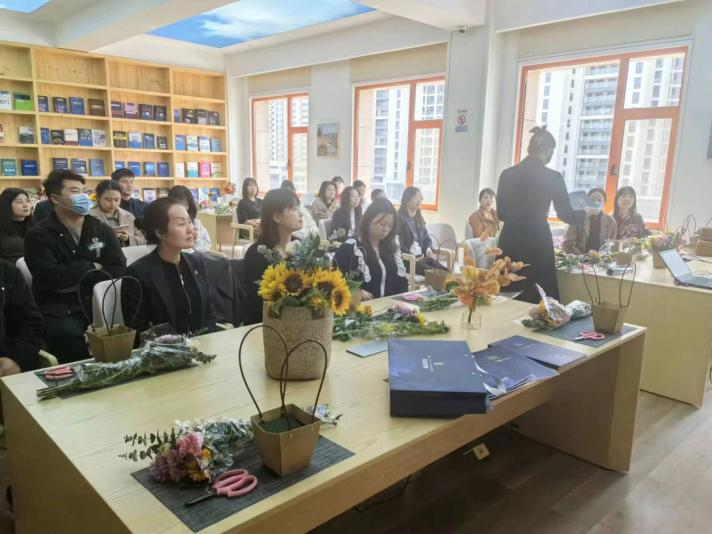 活動(dòng)特邀了專業(yè)的花藝?yán)蠋?,現(xiàn)場(chǎng)為大家進(jìn)行講解和指導(dǎo)?;ㄋ?yán)蠋熢敿?xì)講解了各種花卉所蘊(yùn)含的花語(yǔ)及插花技巧,大家發(fā)揮想象力,用自己靈巧的雙手,將經(jīng)過(guò)修剪的向日葵、非洲菊、康乃馨等多種花材,根據(jù)不同的色彩、形狀有層次地搭配在一起,在馥郁花香中感悟取舍之道、領(lǐng)會(huì)古雅之美。