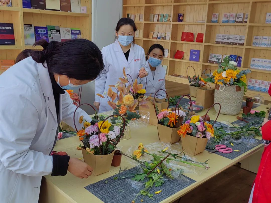 在插花過(guò)程中,每個(gè)人臉上都洋溢著幸??鞓?lè)的笑容,在插花勞作中尋找樂(lè)趣,從作品欣賞中獲得滿足,在相互交流中拉近距離。五顏六色的花材在大家手中被賦予了新的生命和寓意,呈現(xiàn)出一件件清新怡人的花藝作品。此刻,無(wú)論媽媽、妻子、女兒,還是醫(yī)生、護(hù)士,雖然角色不一樣,但都沉浸在專注花藝的體驗(yàn)中。
