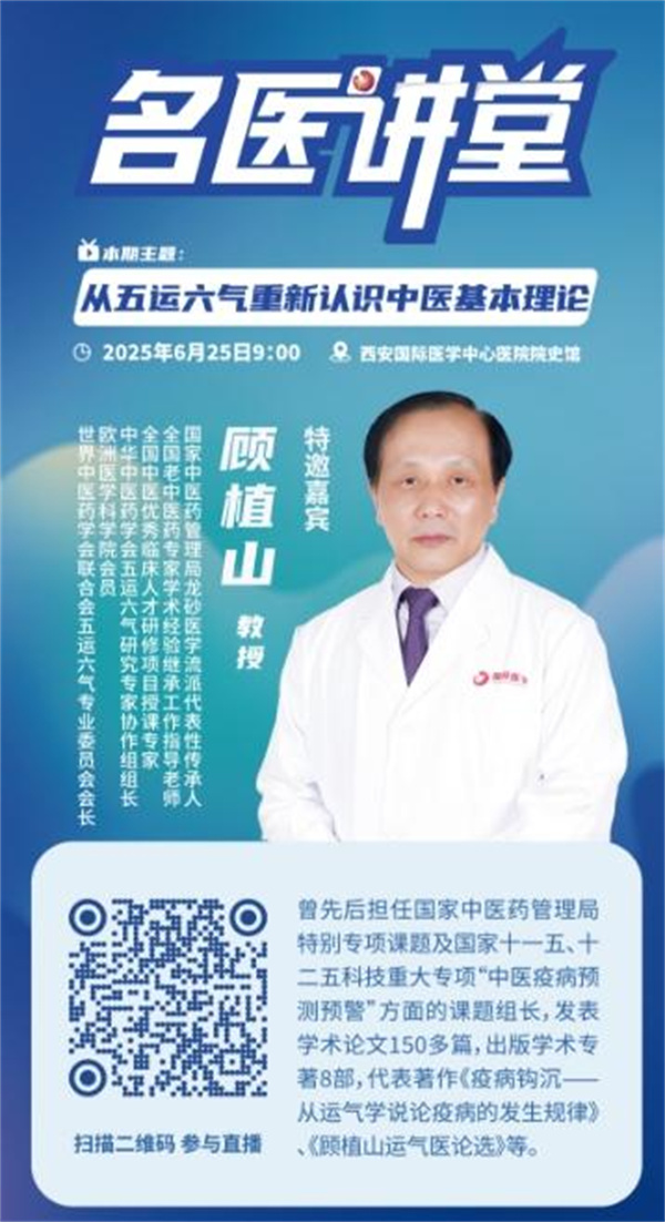 6月25日上午,由西安國際醫(yī)學中心醫(yī)院主辦的"名醫(yī)講堂"系列學術(shù)活動在院史館舉行。本次講座邀請到國家中醫(yī)藥管理局龍砂醫(yī)學流派代表性傳承人顧植山教授,作《從五運六氣重新認識中醫(yī)基本理論》的專題報告。西安國際醫(yī)學中心醫(yī)院尹強院長、中醫(yī)醫(yī)院趙曉平院長、中醫(yī)二科卓鷹主任及科室醫(yī)護人員、百余名中醫(yī)從業(yè)者及愛好者參會學習,重新認識博大精深的中醫(yī)理論。