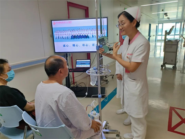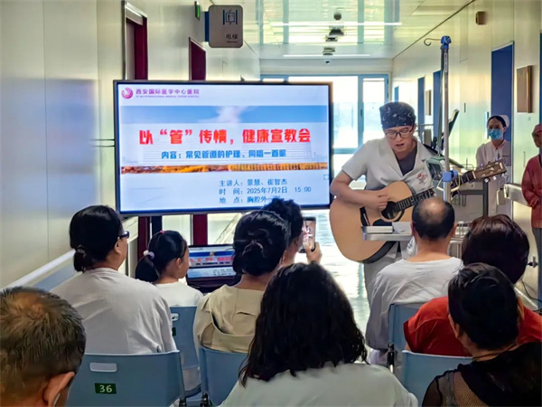 宣教會現(xiàn)場還充滿了溫暖的音符。崔智杰護士巧妙地將音樂療愈融入護理關(guān)懷,為在場患者深情彈唱了《隱形的翅膀》和《月亮代表我的心》。他表示:“醫(yī)護人員和家屬的心愿是一樣的,都期盼患者早日康復(fù)。希望音樂的感染力能為他們增添戰(zhàn)勝病魔的力量?!备杪暡粌H傳遞了關(guān)懷,也進一步拉近了護患距離,增強了患者積極面對疾病的心理建設(shè)。