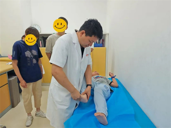 另一邊,楊寧主任近距離觀察孩子的運動模式,手把手指導家長如何進行科學有效的家庭康復訓練,細致講解每一個動作的要領和目標,讓康復融入日常生活。